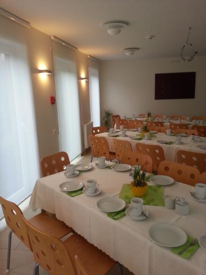 Im Erdgeschoß befindet sich ein großer Mehrzweckraum, Hier wird gemalt, gebastelt oder auf einer großen Leinwand gemeinsam ferngesehen. Während der Fussball-WM wurde hier mit Knabbereien und Getränken gemeinsam mitgefiebert. Auch Geburtstagsfeiern mit allen Angehörigen und Freunden können hier gemütlich gefeiert werden.